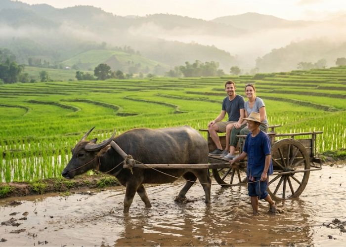現地では、バイクタクシー、ソンテウ、時には水牛車も体験できます。